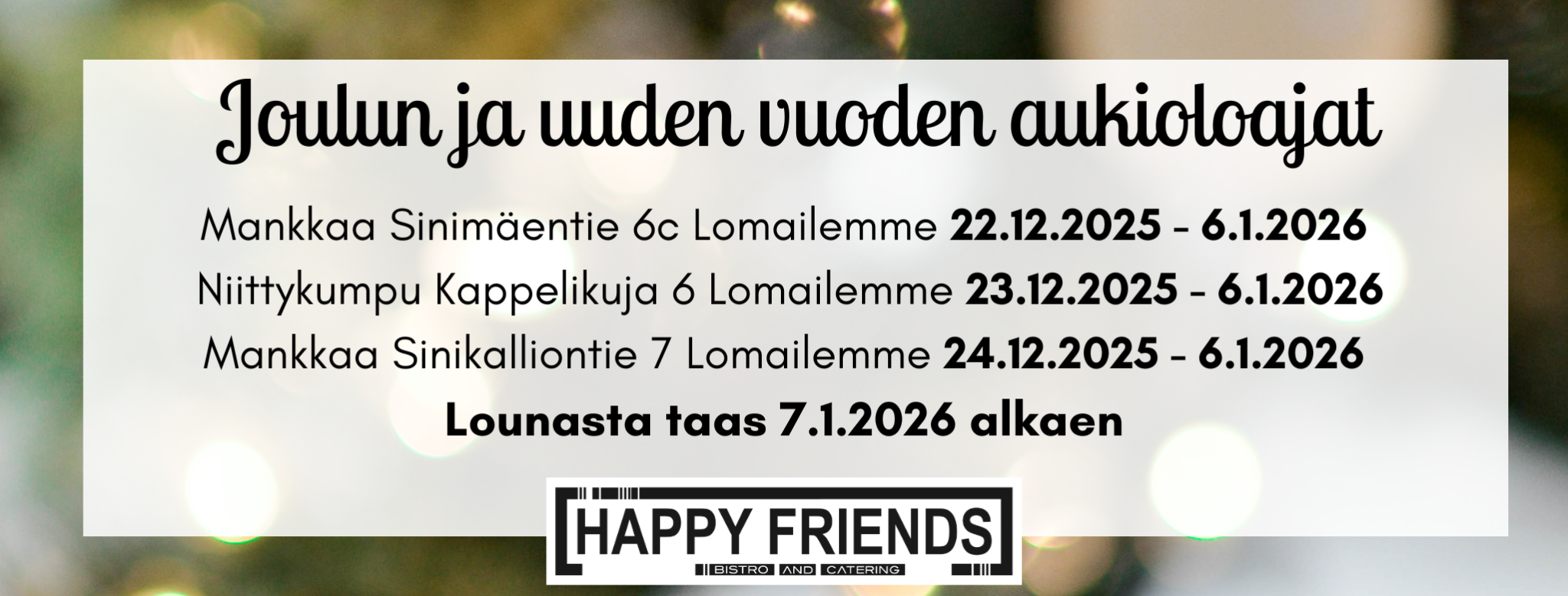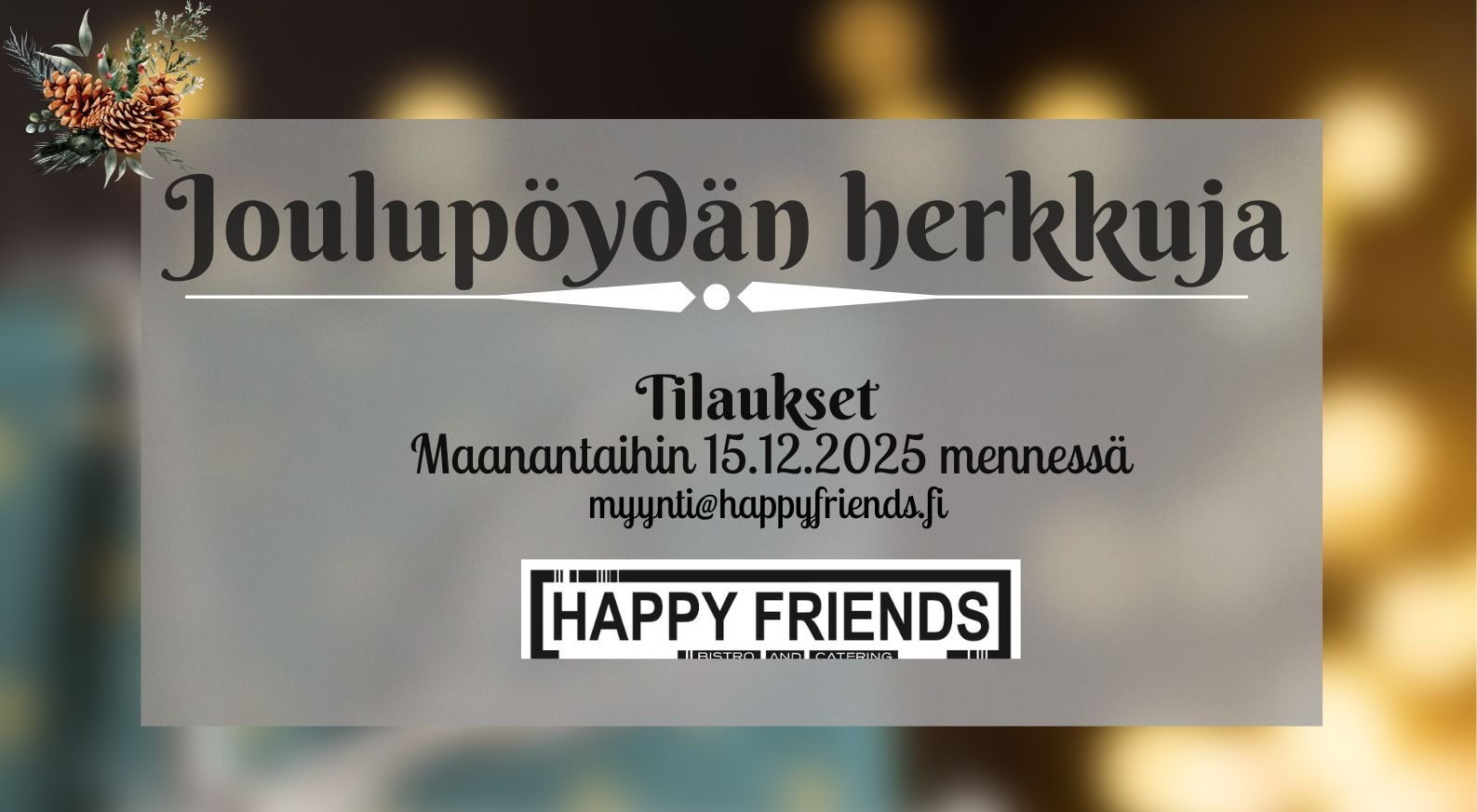 Happy Friends on yrittäjiensä näköinen, sydämellinen, energinen sekä työyhteisönä tiivis perhe, joka on keskittynyt tarjoamaan asiakkailleen elämyksiä lounas- ja catering-palveluissa. Meille tärkeintä on asiakkaidemme toiveiden täyttäminen, nopea ja joustava palvelu, sekä kotimaiset raaka-aineet, joista loihdimme maistuvia elämyksiä ja kokemuksia kaikille. Käyttämämme sian-, naudan-, broilerin- ja kalkkunanliha on aina Atrian suomalaiselta maatilalta.